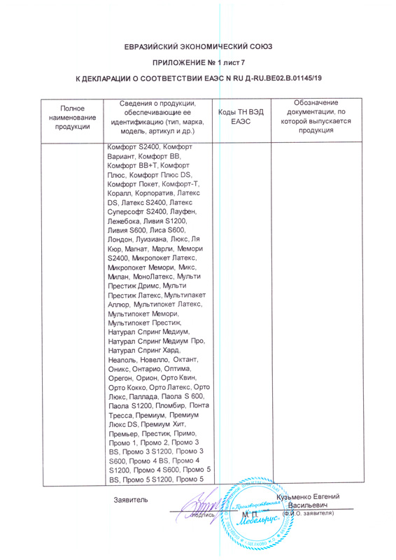 Гарантийные сроки от 18 месяцев до 60 месяцев, с даты, которая указана в накладной, в зависимости от модели матраса